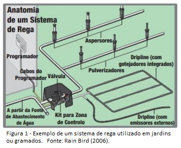 O sistema, de modo simplificado é composto pelo controlador (ou programador), pelas válvulas e pelos emissores (aspersores).   A tubulação é dividida em Linha Principal (LP), que vai da fonte da água até as válvulas e as Linhas Secundárias (LS), que vão da válvula até os emissores, conforme demonstra a Figura 1.